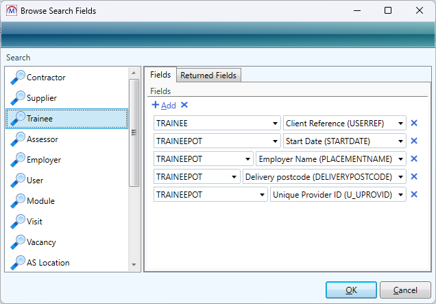 The Browse Search Fields window will appear. Select Trainee on the left.