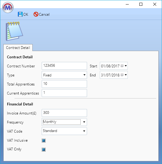 - Start / End – These are the start and end dates of the contract terms. Invoices will only run for learners attached to the contract where their learning start/end dates overlap with the contract terms start/end dates. For example, if a learner is in learning from 01/10/2017 to 01/09/2018 and the contract terms are from 01/08/2017 to 31/07/2018, then invoices for this contract will only be generated for the learner from 01/10/2017 until 31/07/2018.