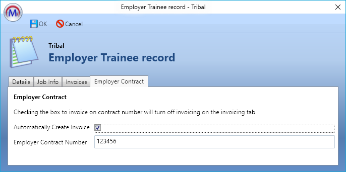 Tick the Automatically Create Invoice box. Note that this is mutually exclusive to invoicing using the Invoices tab, and once ticked it will change the frequency on the Invoices tab to Never. Similarly, changing the frequency on the Invoices tab will untick the box on the Employer Contract tab.