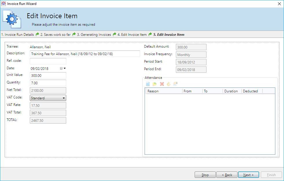 Repeat for additional learners as required. When you perform an invoice run, the invoices for these learners will now be generated.