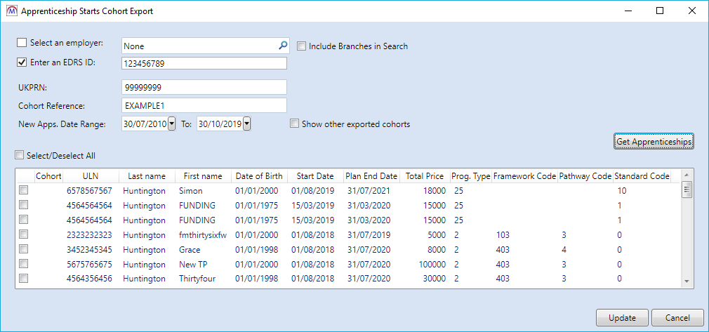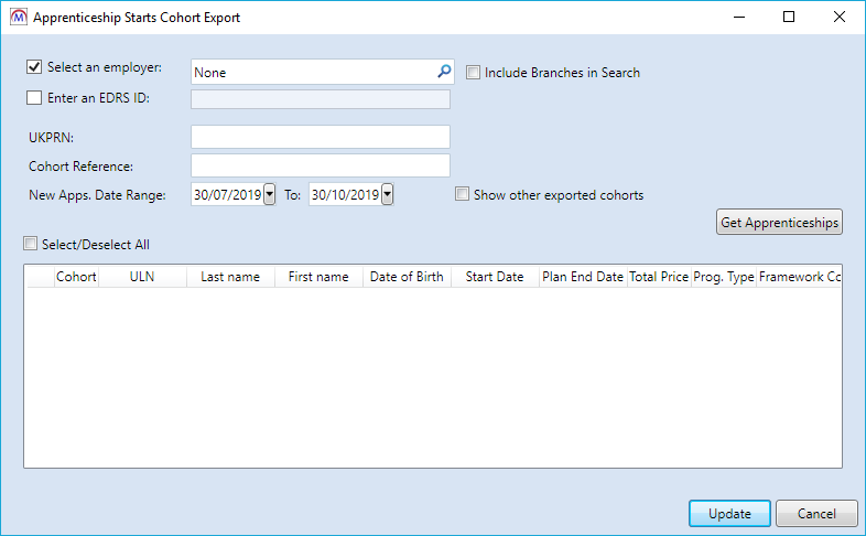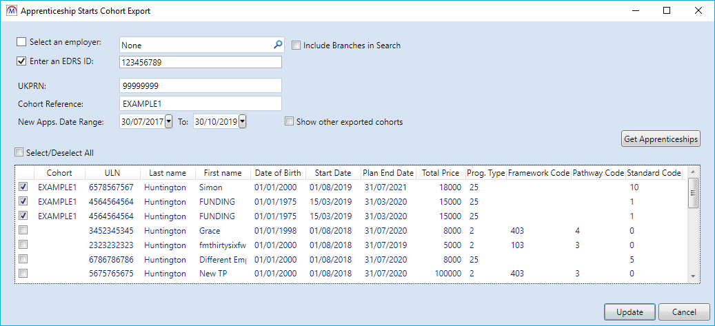 - Once you have selected the learners you wish to export under the entered cohort reference, click Update. This will populate the AS_EXPORTED_APPS table with a list of the learners under the specified EDRS ID, UKPRN and apprenticeship, along with the cohort reference they have been grouped under. An export file of the data will also be produced.