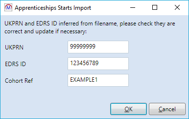The UKPRN, EDRS ID and cohort reference will be derived from the import file. You will be prompted to check and revise them if necessary. Click OK when ready.