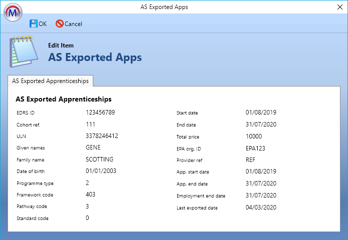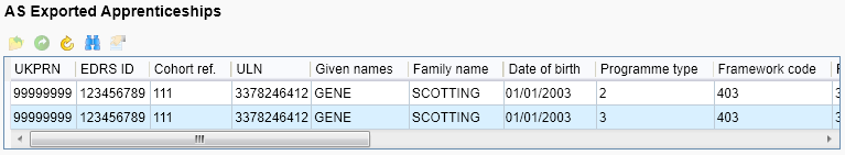To view the tab, open a learner record and go to AS Exported Apprenticeships. The tab consists of a grid which lists all data produced by the AS export for the learner.