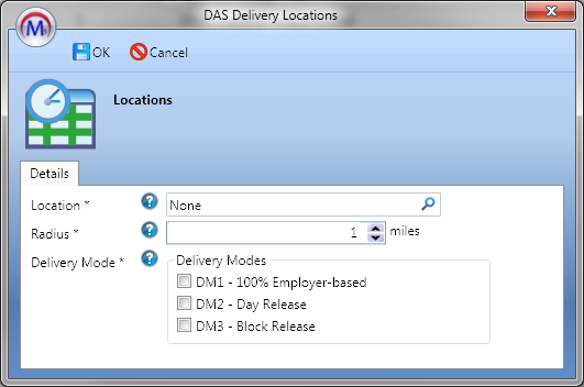 button and search for the location to add (these are taken from the AS locations for your provider). Select the location and click OK. - Enter the catchment area radius in miles. This should be the radius from the location within which you are prepared to deliver Apprenticeships.