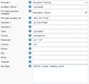 - Enter the location details. At minimum, the Provider, Location Name and Postcode fields must be completed (note that the Provider dropdown list is populated by the provider records added to the system).