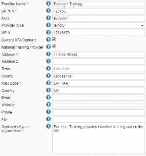 Enter the provider details. At minimum, the Provider Name, UKPRN, Post Code and Overview of your organisation fields must be completed.