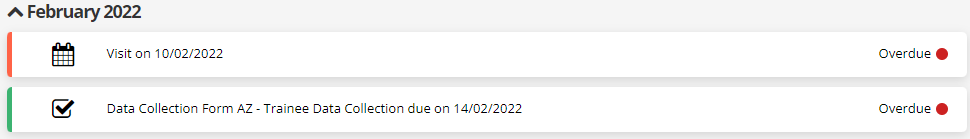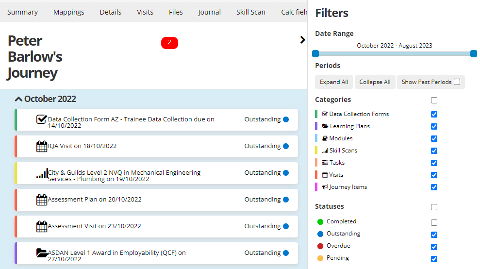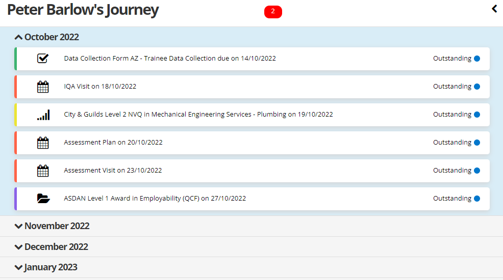 The Learner Journey module is a streamlined view of a learner's important events on a month-by-month basis, available for assessor and learner users. The following events are included: