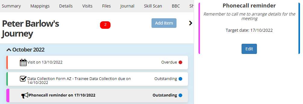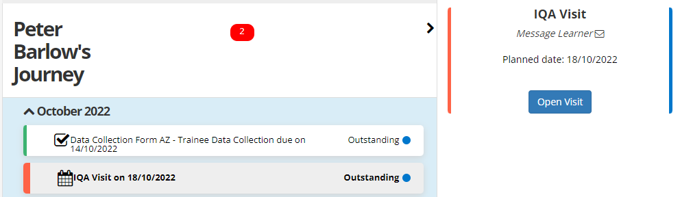 Some items will have additional options on the right - e.g. on the IQA Visit example above, the Message Learner envelope can be clicked to open a new message for the learner and the Open Visit button can be clicked to view the full details of the visit.