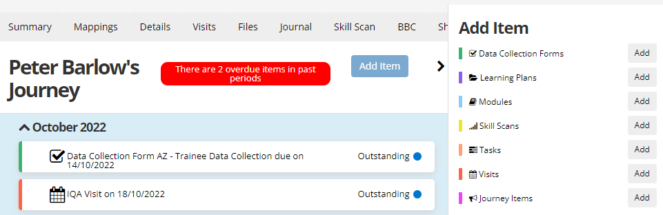 An Add Item button can be enabled on the Learner Journey screen which allows you to quickly add any of the items which can appear on the Learner Journey.