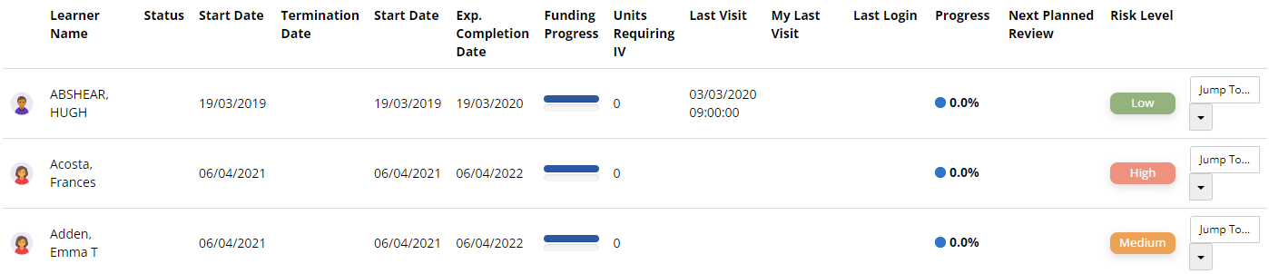 Learners can be graded as high, medium or low risk in the Learner Journey.