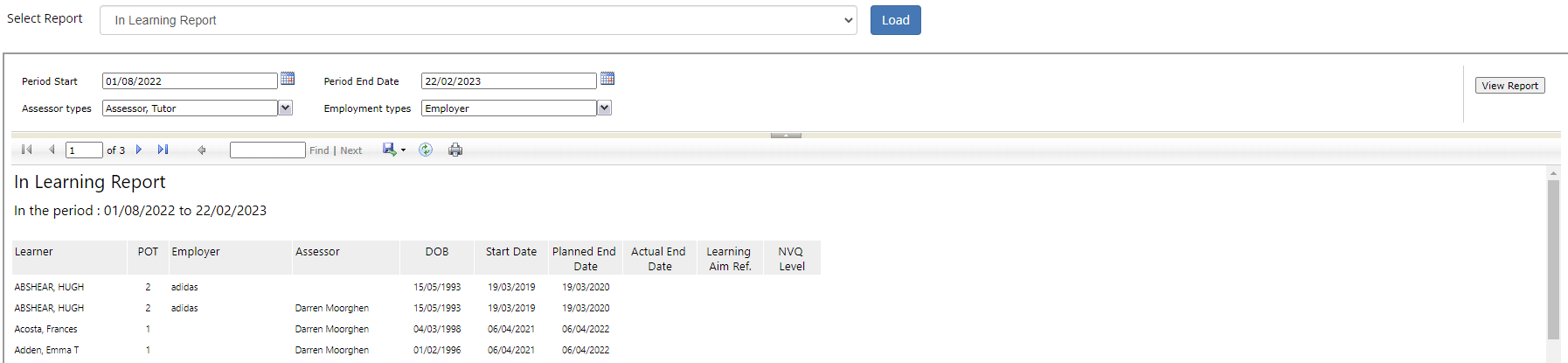 - Report on – This lets you report on learners in-training, starters, framework achievements or NVQ achievements.