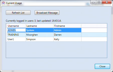 Once enabled, go to the Support tab and click Current usage. A window will appear listing all users currently logged into Maytas.