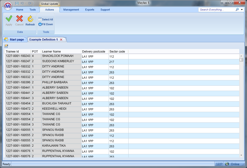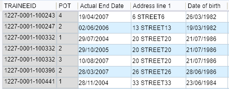 Some fields may be greyed-out, which indicates that the data in them cannot be altered in the Global Updater. This can be because they are calculated fields in the view (e.g. Learner Name in the above example, as it is defined in the view as FIRSTAME + ' ' + LASTNAME), from non-trainee tables (such as CONTRACTOR) or if the fields are primary keys (such as TRAINEEID and POT).