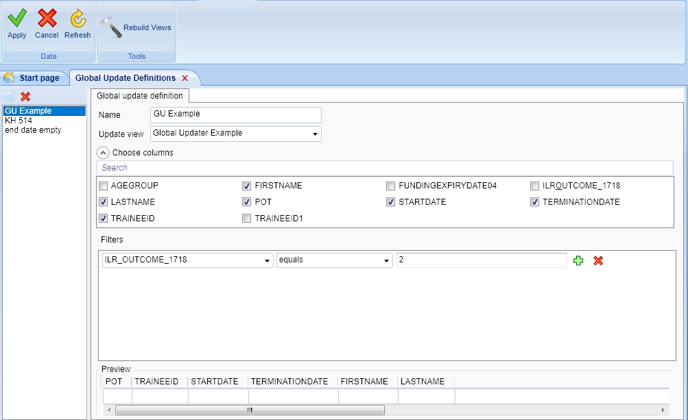 Please note that existing Global Updater definitions may have additional primary key fields included after the rebuild. Primary key fields are greyed-out and cannot be edited (e.g. TRAINEEID and POT in the screenshot below).