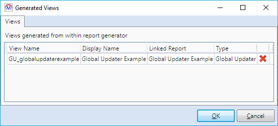 Each row tells you the view and display names of the view and which report it is linked to. To delete a view, select the row and click the red cross at the end of the row. Click Yes to confirm. Please note that if the view is used in any Global Updater definitions, it cannot be deleted until the definitions have been deleted (or changed to use a different view).