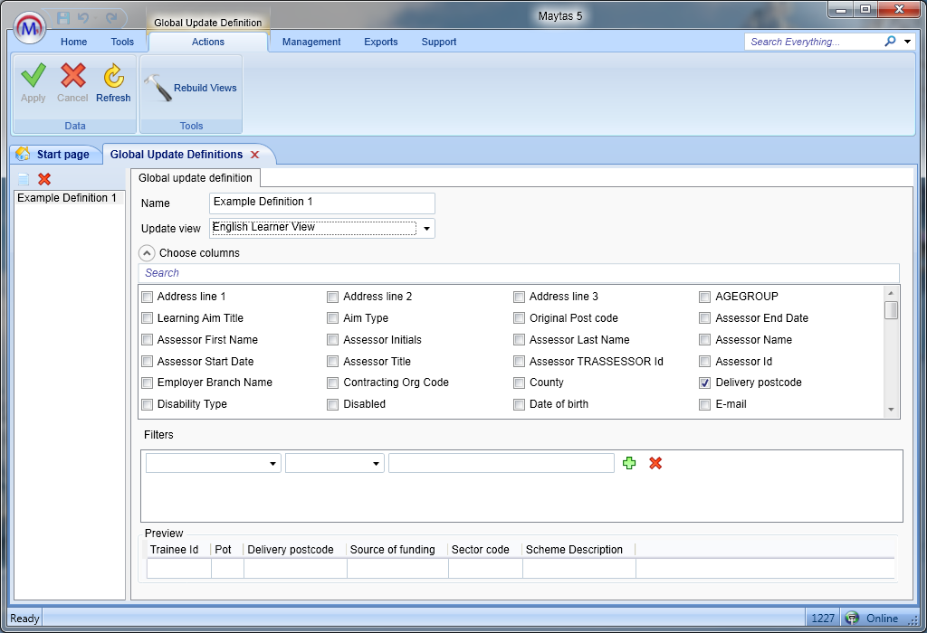 You can also apply filters to the data to only include certain rows, and the filters do not have to be for fields selected in the definition. For example, you may wish to update the delivery postcode for all learners assigned to a particular assessor, therefore you could filter by that assessor. In the filters section, complete the three dropdown boxes: