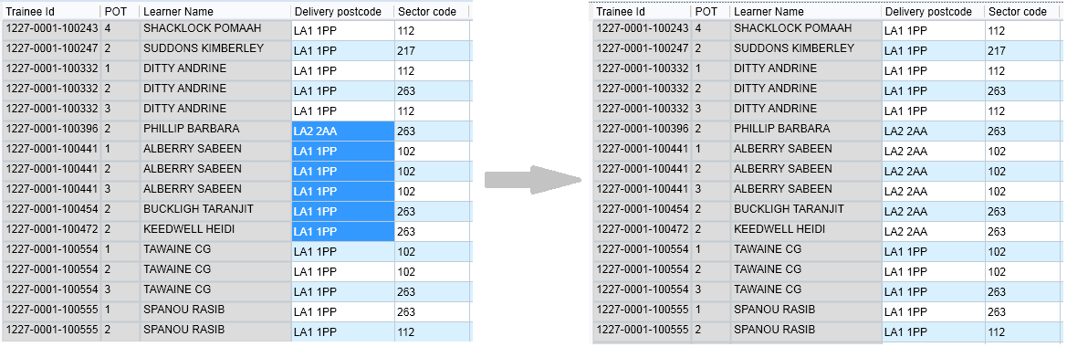 The way updating works is that all selected rows are updated to the value in the top selected row. For example, the delivery postcode for all the selected rows here will be updated to LA2 2AA, as that is the value of the top selected row: