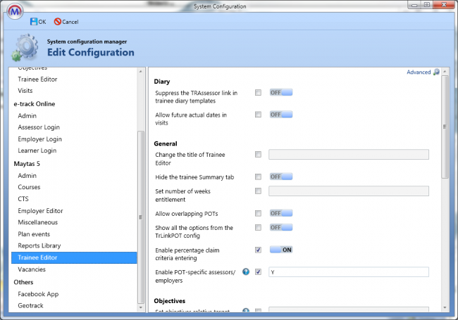 If you wish to access the old system config editor from previous versions of Maytas, click the Advanced button at the top right of the editor. It can also be accessed as in previous versions by going to Support | Edit Config.