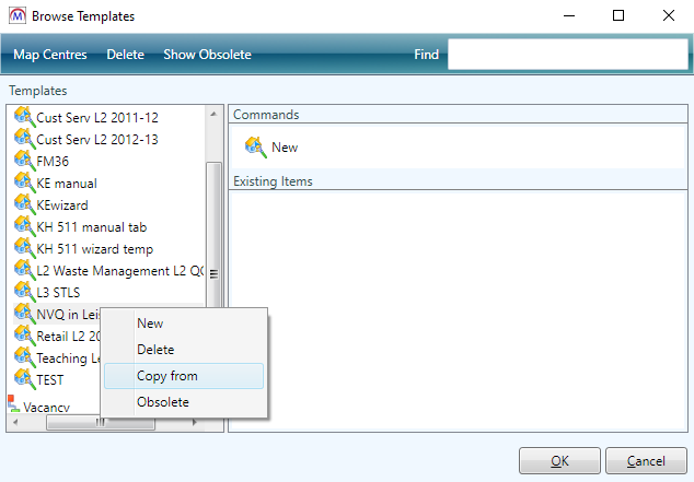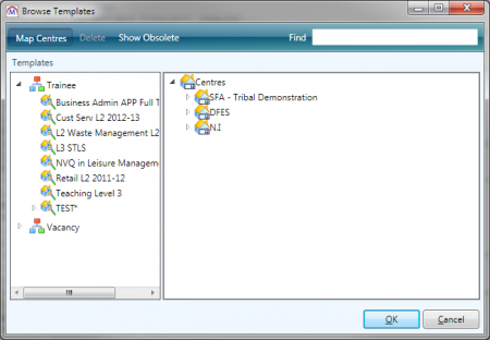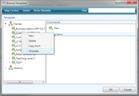 To remove a template mapping from a centre or contract, right-click the template on the right side of the screen and select Delete. Click Yes to confirm.