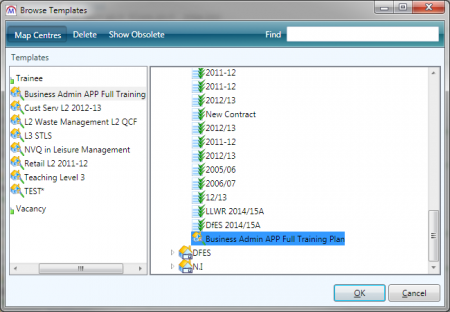 Templates in Maytas 5 allow you to apply a pre-determined set of data on an entity such as a learner, assessor or employer. For example, when a learner is taking certain qualifications, some fields will always require one specific value. A template can be created to set these values automatically when the learner is placed on the qualification. Another example would be a leaver template which sets fields detailing progress to the appropriate value for leaving a qualification (different templates could be set up for early leavers, suspensions, achievers, etc).