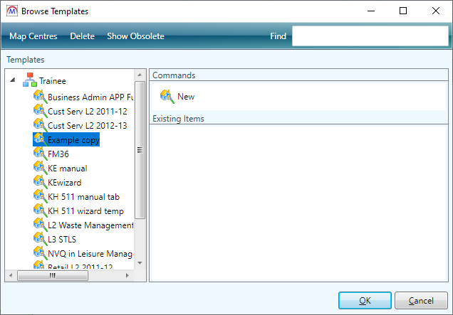 - In the window that appears, the different areas of the database are listed on the left. When hierarchical templates have been setup, these can be drilled into on the left. Select Trainee.