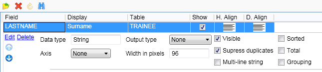 To configure a field in the report designer, simply select it in the design list. You will then see a number of options: