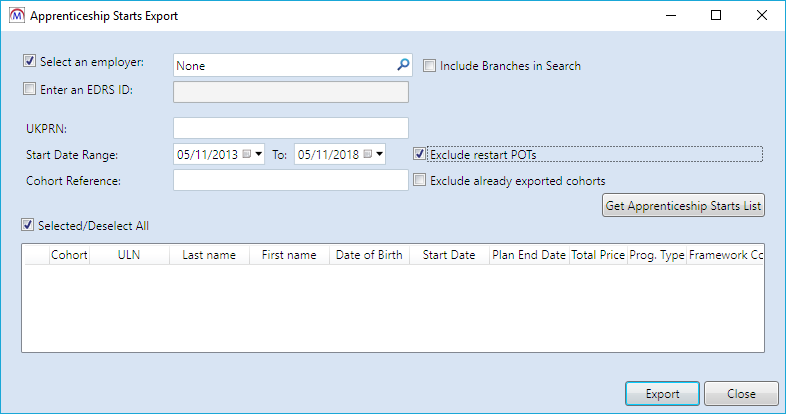 The option to exclude POT restarts will now appear on the Apprenticeship Starts Export screen. When this option is ticked, an apprenticeship will be excluded if the POT on which the apprenticeship starts has the restart indicator entered on the programme aim.