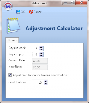 Using the screenshot as an example, the learner is only being paid 4 days out of 5 for a standard weekly rate of £40, with a weekly trainee contribution of £10. The daily rate would therefore be £8 (£40 divided by 5) with a £2 contribution (£10 divided by 5). The new rate would be the current rate minus the daily rate, i.e.: