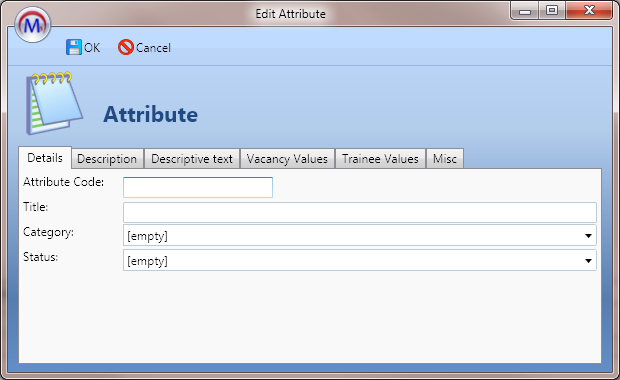 - Not Required – This is only meaningful when set for vacancy attributes. From the vacancy module, it prevents the attribute from being included in the search criteria. From the trainee module, any vacancy attribute with this flag is prevented from contributing to the grading system in the search criteria.
