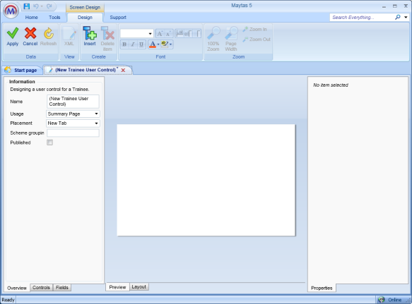 - The left panel. This has three sections (at the bottom): Overview, which lets you set a variety of miscellaneous screen features; Controls, which lets you add controls to the screen; and Fields, which lets you add fields to the screen.