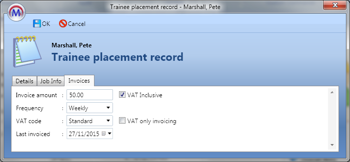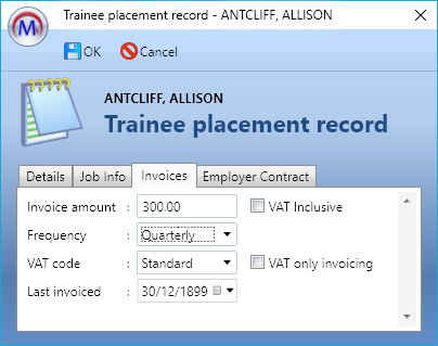 - Last invoiced – This date will be automatically completed when the first invoice run is processed. If you do not want the invoice to generate back to the learner’s start date with the employer, this date should be set to the previous month’s end date or the day before you want to start invoicing.