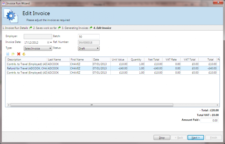 buttons respectively.If you chose the Stop on all invoices option, the run will halt on each invoice in the run. The Edit Invoice screen shows the relevant allowance items in a grid.