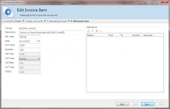 The item details can be amended as required here. Any un-deducted attendance records for the invoice run period will be displayed on the right. Attendance records can be added or edited using the