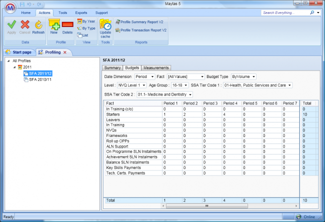 The profiling module is a management tool designed to enable the generation, comparison and reporting of actual figures against budgeted figures for income based on learner volumes, achievements or other outcomes.