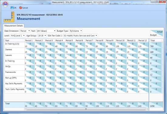 After the initial budgeting profile figures have been entered, a measurement of performance can be taken at any time. The results of the measurement will display the actual performance against the budgeted performance, for multiple funding programmes. A number of reports are available to provide a useful overview of the budget vs. actual volumes and values, as well as drilldowns detailing the contents of the summary figures.