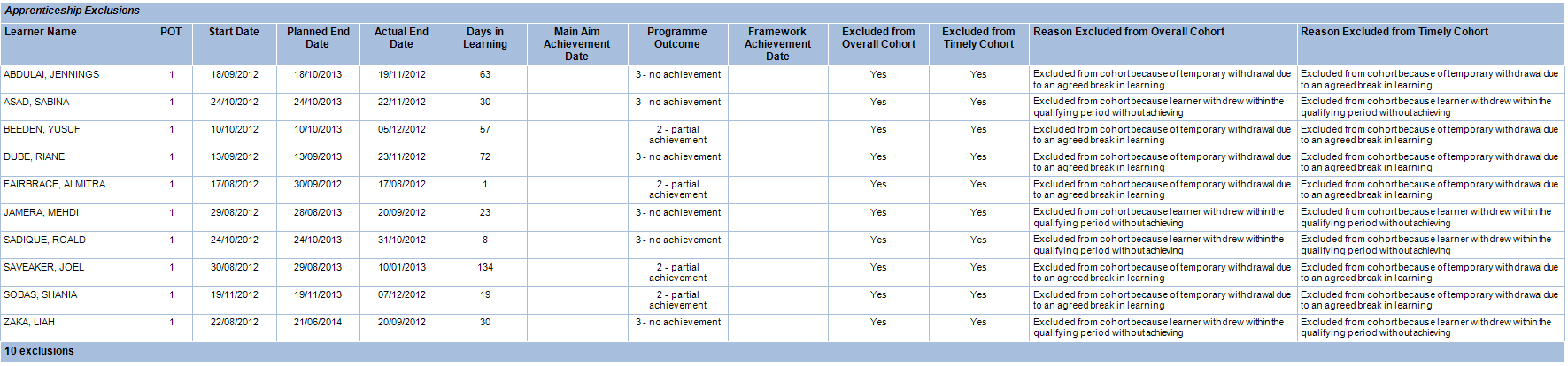 The report lists aims which are excluded from the Apprenticeship and ET Achievement Rates. For each aim the report shows the key dates, the days in learning, whether it is excluded from the overall and timely cohorts and the reason for exclusion from the overall / timely cohorts.