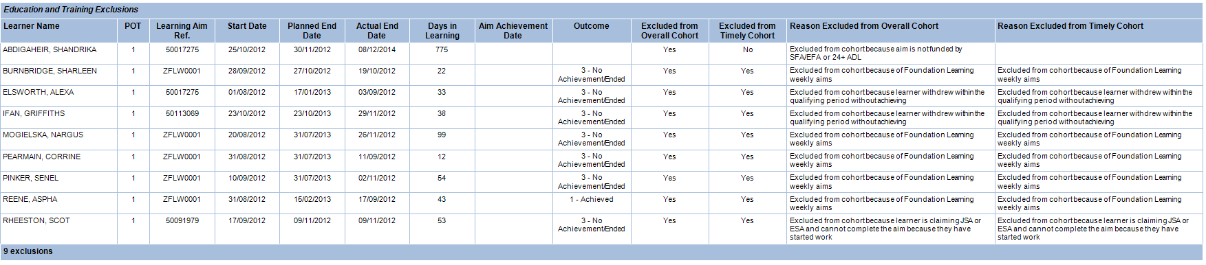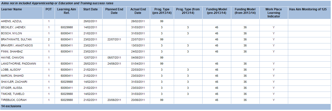The Achievement Rate Exclusions report lists aims which are excluded from the Apprenticeship and ET Achievement Rates. If a learner or aim is not appearing in the Achievement Rates and it is not clear why, this report helps to identify the reason.