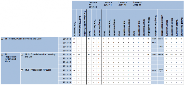 The next set of columns is grouped by contract year. The specific years are determined by the Last Report Year parameter (see above). For each year, the columns show the total number of leavers, the number of leavers which were successful and the number of leavers which were timely and successful.