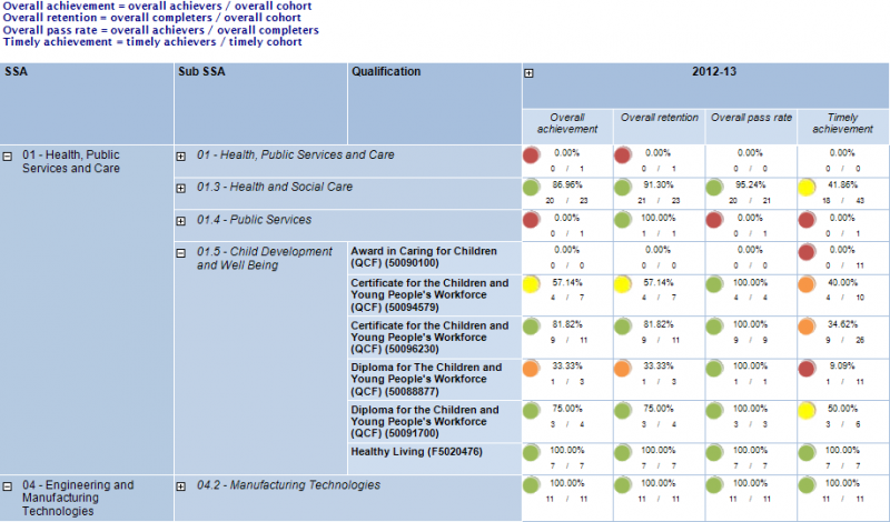 Each of these includes a 'traffic light' (green, amber or red) which is set according to the values in the threshold parameters. This allows you to quickly see general achievement levels for each area.