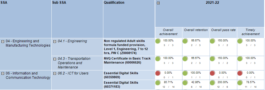 Each of these includes a 'traffic light' (green, amber or red) which is set according to the values in the threshold parameters. This allows you to quickly see general achievement levels for each area.