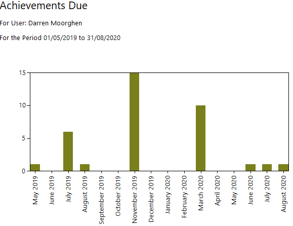 The report consists of a chart of achievements due in the selected date range, with a summary table of the data below it.