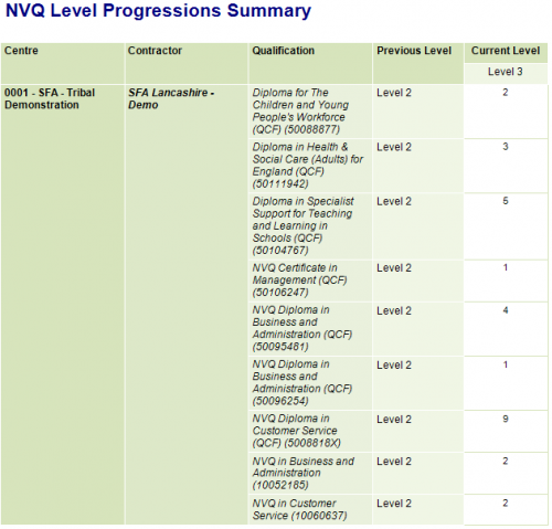 The Aim Level Progressions Summary report shows a summary of main aims which have progressed to a higher aim level from one POT to the next. In functional terms, this means the report includes POTs where the main aim level is higher than on the previous POT. For example, if a learner has POT 1 with a main aim level of 1 and a POT 2 with a main aim level of 2, POT 2 would be included in the report. The aim level is taken from the LARS/LARA/LAD (in that order of preference). The report interprets aim levels of E, M, U and X as level 0, and level H is interpreted as level 9. All other levels remain as they are in the LARS/LARA/LAD.
