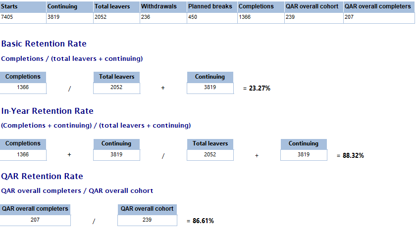 In-year retention rate - (completions + continuing) / (total leavers + continuing)