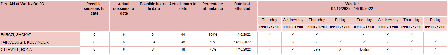 - Percentage attendance - The percentage of actual sessions out of possible sessions.