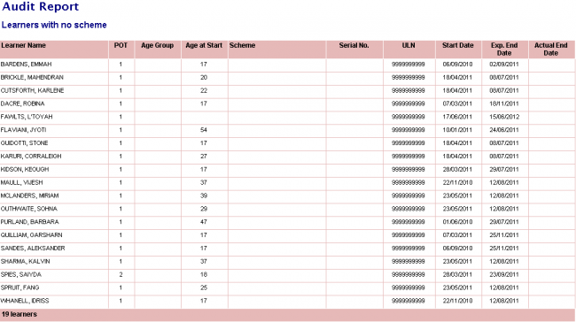 | Learners with no serial number | Learners who have no serial number (L03 Learner Ref. No. on the ILR). |