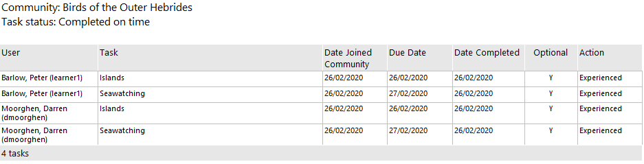 The Community Task Progress report shows a summary of tasks assigned via communities, grouped by the task status.