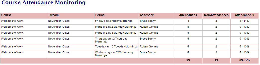 The Course Attendance Monitoring report shows the attendance percentage for each course stream.
