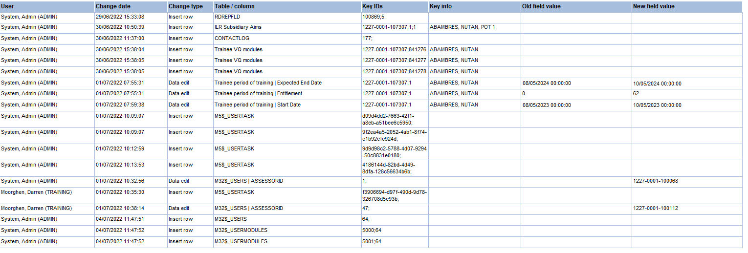 The Data Changes report shows a list of changes by users in a date and time range from both Maytas 5 and Maytas Hub. This is based on data in the M32$_WEB_USERCHANGES table, though not everything from that table is shown (e.g. internal changes such as funding cache updates are not shown). The results in the report are data changes performed by users, such as creating or deleting a learner record, directly editing a field or importing data via the Standard Import system.