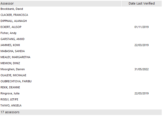 The Date When Last Verified report lists assessors in the logged-in user's team and the date they were last verified by an IQA user.