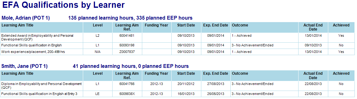The EFA Qualifications by Learner report lists the qualifications each EFA learner is enrolled upon.